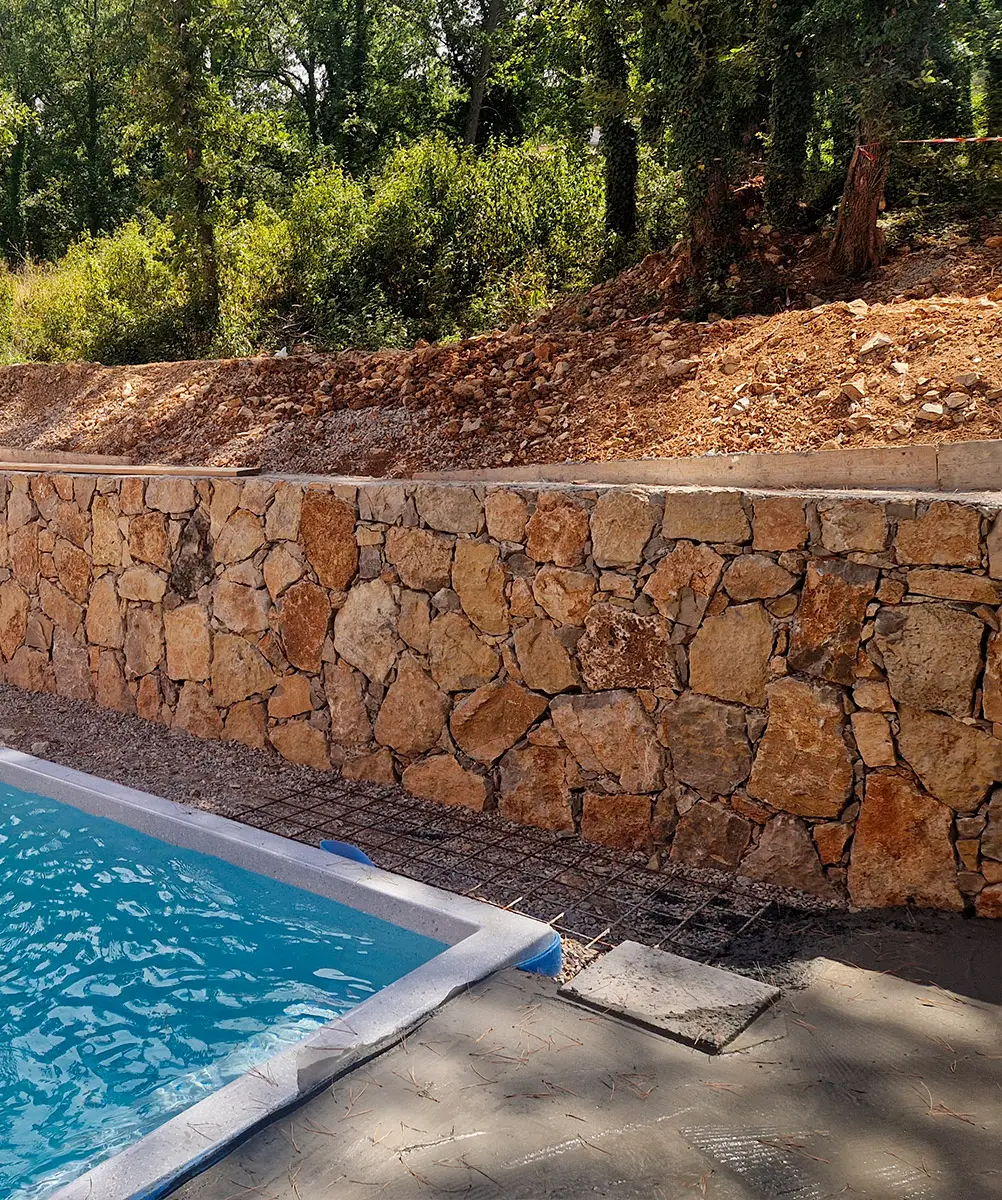 • Réalisation de murs en pierre : Pour un cachet authentique et provençal, nous bâtissons des murs de soutènement ou décoratifs en pierre naturelle, idéaux pour structurer vos restanques.