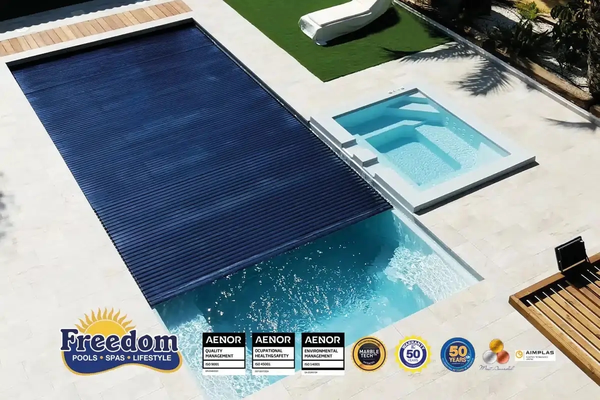 Modèle imposant de 10,45 x 4,25 m, l’Atlantis 10 avec volet immergé offre 52 m³ de volume. Sa structure monobloc renforcée accueille le mécanisme de couverture pour une finition parfaite. Installation experte garantie par RC Piscines.