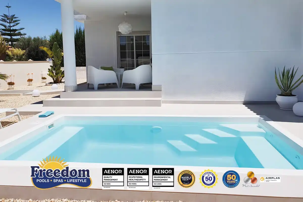 Idéale pour les terrains étroits, la City (4,40 x 2,65 m) offre 11 m³ de rafraîchissement. Ce modèle compact bénéficie de tout le savoir-faire Freedom Pools : margelles intégrées, escalier antidérapant et finition d’exception. Une solution de baignade efficace pour les villas des Alpes-Maritimes.