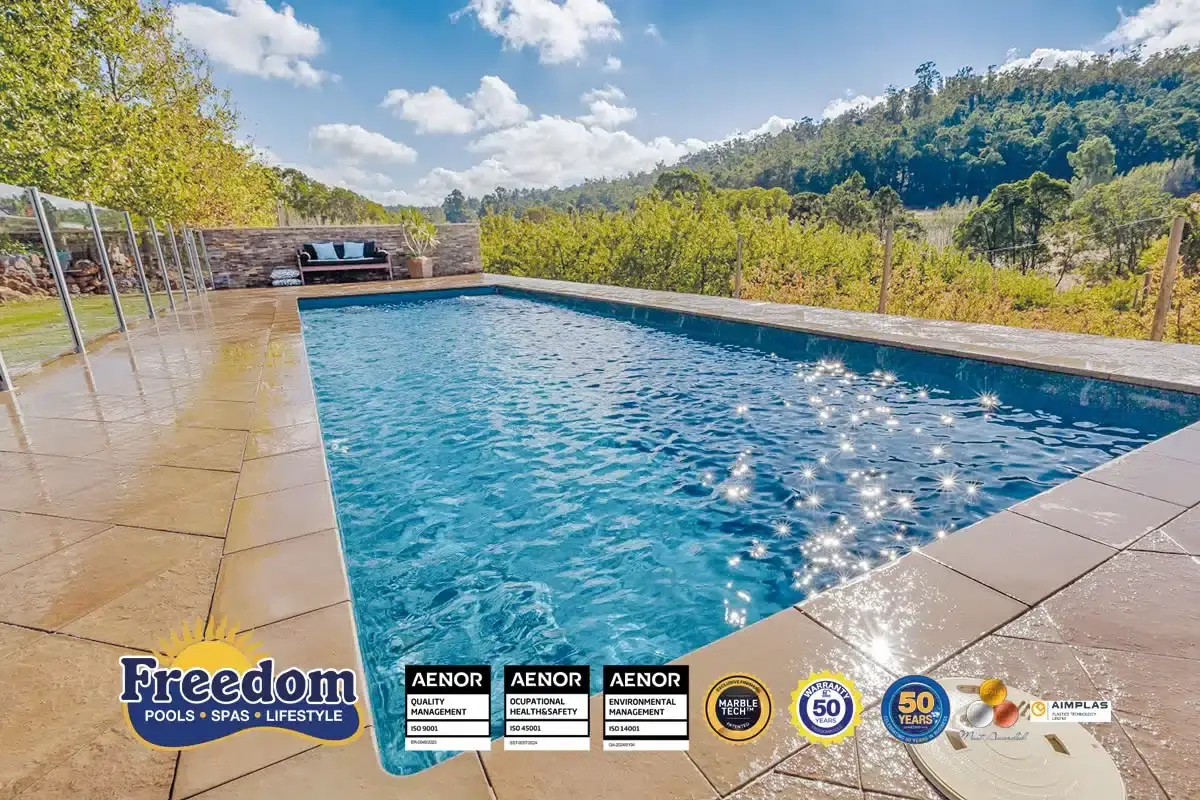 Avec ses 7,00 x 4,20 m, la Platinum 7 propose 30 m³ de volume. C’est l’équilibre parfait pour les propriétaires souhaitant une piscine spacieuse mais facile à entretenir. Sa structure renforcée est adaptée aux climats chauds des Alpes-Maritimes.